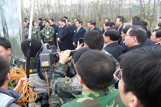 4月10日上午,山東省黨政代表團(tuán)在省委書(shū)記姜異康、省長(zhǎng)姜大明率領(lǐng)下,到北川新縣城檢查指導(dǎo)援建工作,山東省十七地市黨政負(fù)責(zé)人參加檢查。徐鵬強(qiáng)董事長(zhǎng)在集團(tuán)公司援建的安昌河堤頂?shù)缆飞嫌訖z查團(tuán)并陪同檢查。