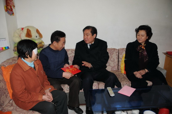 1月19日上午,濰坊市政協(xié)主席趙興濤,市政協(xié)副主席、市總工會(huì)主席滿(mǎn)國(guó)強(qiáng)等在集團(tuán)公司董事長(zhǎng)徐鵬強(qiáng)陪同下,分別走訪慰問(wèn)了集團(tuán)公司全國(guó)勞模劉洪章和兩個(gè)困難戶(hù)家庭——第二分公司任文君和物業(yè)分公司趙淑貞。陪同走訪的還有市建設(shè)局黨委副書(shū)記高峰,集團(tuán)公司高管層領(lǐng)導(dǎo)滕忠斌、李坤明等。 ![]() 徐董事長(zhǎng)陪同趙興濤走訪 ![]() 走訪趙淑貞 ![]() 走訪任文君 ![]() 走訪慰問(wèn)全國(guó)勞模劉洪章 ![]() 與劉洪章合影留念