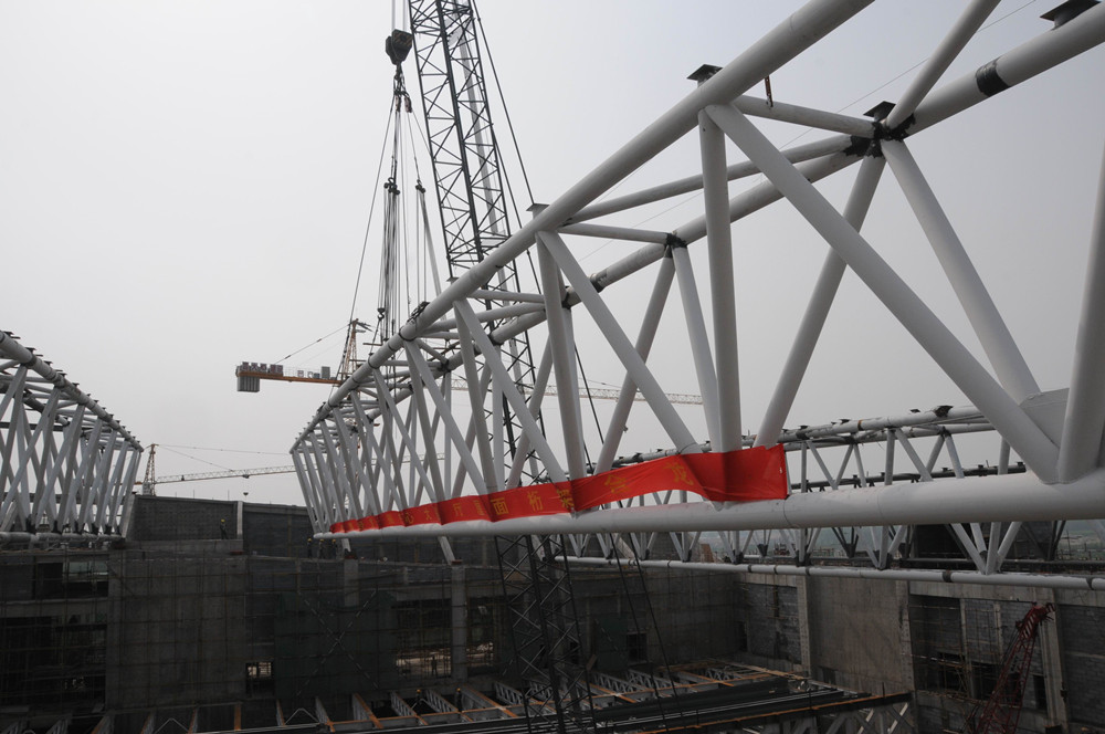 518下午,會(huì)展中心展覽廳最后一榀鋼構(gòu)桁架順利吊裝就位,至此會(huì)展中心屋面17榀鋼結(jié)構(gòu)吊裝工程順利完成。