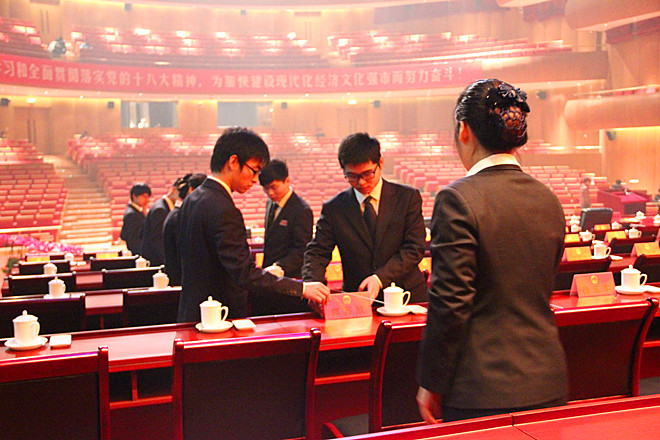 由于本次會議市政府要求不安排專業(yè)禮儀公司承接,這樣會務(wù)的服務(wù)接待任務(wù)也全部落在了公管公司。為做好會議接待服務(wù)工作,從2012年12月中旬開始,公管公司挑選了35名人員并聘請專業(yè)講師進行培訓(xùn)。除此之外,公管公司執(zhí)行董事李坤明親率公管公司領(lǐng)導(dǎo)班子成員和員工全面投入會務(wù)保障工作。會務(wù)期間,投入保潔75人,保安42人,接待35人,消防18人,電力保證12人,物資保障20人,制作安裝宣傳標語和引導(dǎo)牌200多塊,擺放花卉200多盆,鋪設(shè)地毯3341 平方米,調(diào)用桌子180張,椅子250把,沙發(fā)15套,各類會議用品30多個品種。全面、高效、順利完成了對本次會議的保障工作。