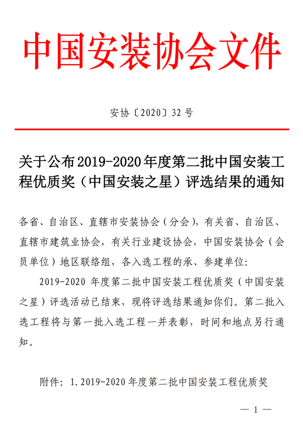 2020年12月10日,中國安裝協(xié)會發(fā)布通知,通報2019-2020年度第二批中國安裝工程優(yōu)質獎(中國安裝之星)項目,共222項,集團安裝公司承建的濰坊市第二人民醫(yī)院門診病房綜合樓一期(安裝工程)(第144位排序)榮獲該項榮譽。這也是集團建司以來首次參評并獲該項榮譽。據(jù)悉,該批次入選項目由272家會員企業(yè)擇優(yōu)推薦,初審243項工程,后經(jīng)專家審定了238項工程進入今年10月的現(xiàn)場復查,11月,再由大評委無記名投票,產(chǎn)生最終的222項工程入選2019-2020年度第二批中國安裝工程優(yōu)質獎(中國安裝之星)。中國安裝之星,是經(jīng)住建部批準設立的安裝行業(yè)最高質量獎,也被稱為安裝工程的“魯班獎”,由中國安裝協(xié)會組織實施,每年評選一次。 集團首次參評即獲得該項榮譽,一是說明集團對安裝專業(yè)的重視,二是說明集團立足品牌戰(zhàn)略,安裝專業(yè)自我加壓開始走向更高層次專業(yè)化平臺,為集團的后續(xù)發(fā)展提供了有力支撐。 ![]() |