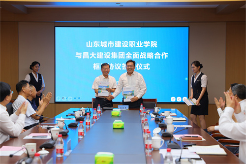 2024 年 6 月 21 日下午,美麗的泉城濟南,山東城市建設職業(yè)學院校園內,山東城市建設職業(yè)學院與昌大建設集團全面戰(zhàn)略合作框架協(xié)議簽約儀式現場隆重而簡約。中共濰坊市委書記劉運、山東省住房和城鄉(xiāng)建設廳黨組書記任海濤現場見證這一銘典時刻。濰坊市住建局黨組書記、局長馬冰同志出席活動。
